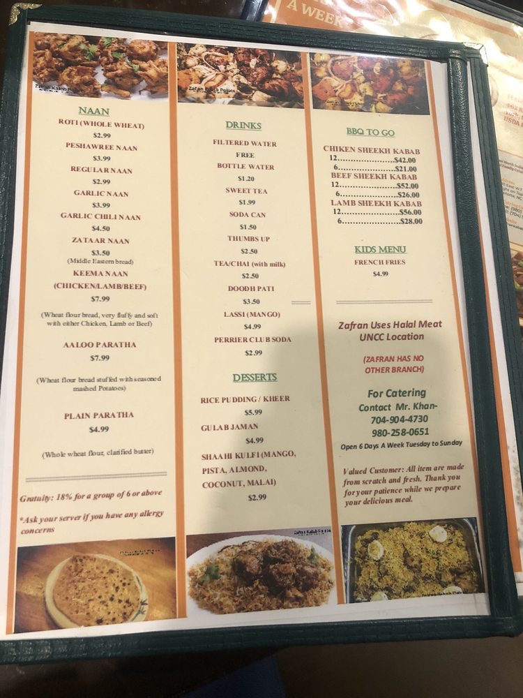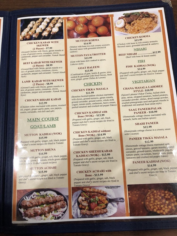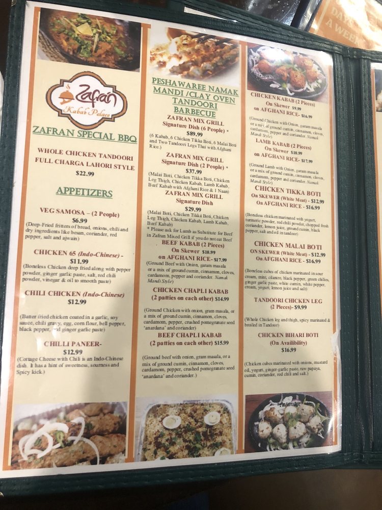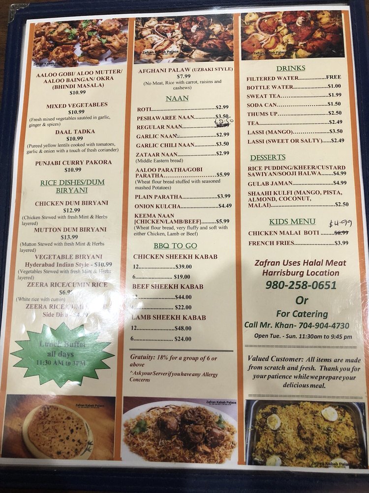 Zafran Kabab Palace, located in Charlotte, NC, offers a range of Pakistani and Indian cuisine with Halal options. With amenities like reservation options, delivery, vegan and vegetarian dishes, and wheelchair accessibility, this restaurant caters to a diverse clientele. Customers rave about the flavorful dishes, such as the Lamb Kebab, Tikka Masala, and Garlic Naan. The welcoming owner, Riaz, adds a personal touch to the dining experience. The Peshawari Namak Mandi Tandoori BBQ and the Zafran Mix Grill are standout dishes that showcase the restaurant's skillful preparation. Despite its simple ambiance, Zafran Kabab Palace impresses diners with its delicious food and attentive service. If you're looking for authentic Pakistani and Indian flavors served with warmth and hospitality, this is the place to visit.